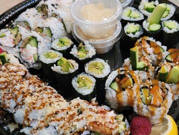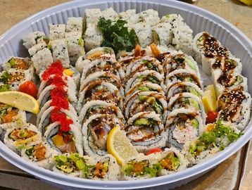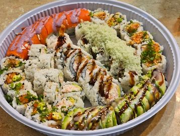 4pc Veggie spring rolls, California R, Dynamite R, Tuna M, Salmon M, 10pc Nigiri (2AT salmon, 2Tuna, 2Ebi, 2Tai, 1Inari, 1Tamago)