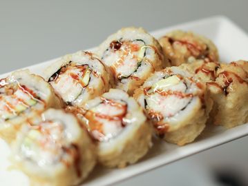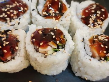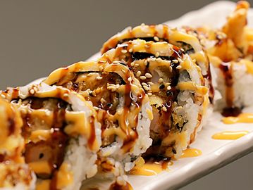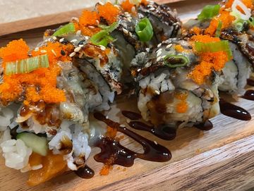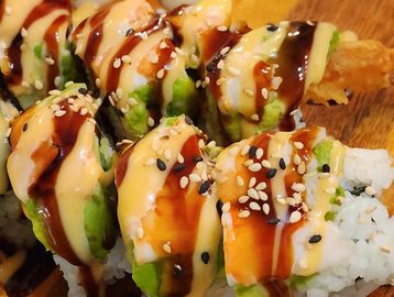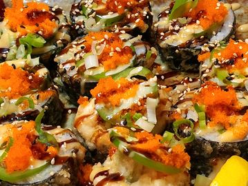 [Cucumber, Smoked salmon, Shrimp tempura] Deep fried Unagi, Avo, Tobiko, Spicy sauce, Spicy Mayo, Brown sauce, Green Onion, Sesame seeds