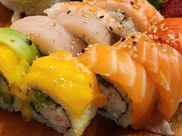 [Cucumber, Avo, Crabmeat] Salmon, Tuna, Ebi, Avo, Mango, Sesame seeds
