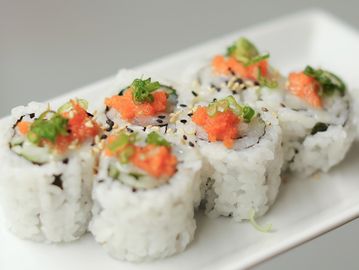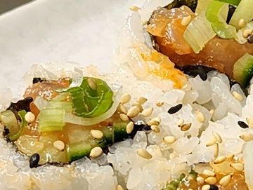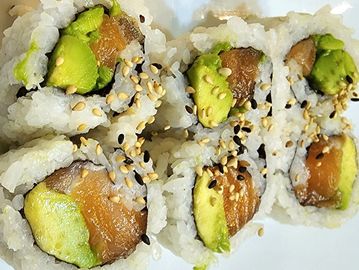 Avocado, spicy salmon topped with green onion & sesame seeds