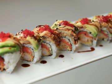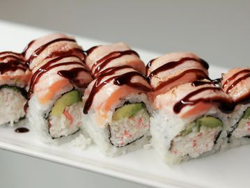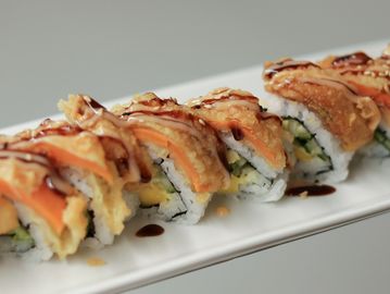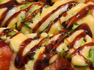 [Cucumber, Shrimp tempura, Crabmeat] Avo, Wild salmon, Jalapeno, Spicy Mayo, Brown sauce, Tobiko, Green onion, Sesame seeds
