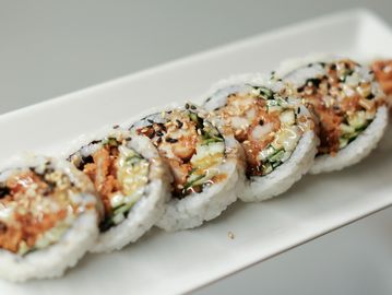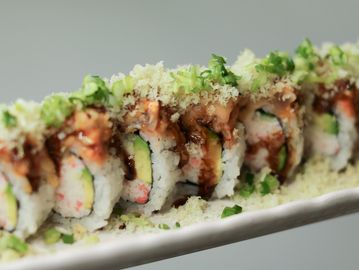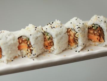 Cucumber, avo, yam tempura topped with Veggie sauce and sesame