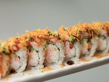 Cucumber, crabmeat, spicy tuna topped with deep-fried seaweed, masago, brown & wasabi mayo sauce, green onion, sesame seeds