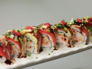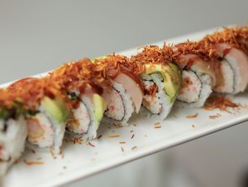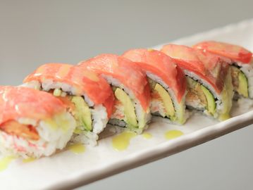 Spicy tuna, cucumber, topped with smoked salmon, avo, jalapeño, spicy mayo and brown sauce