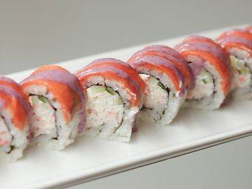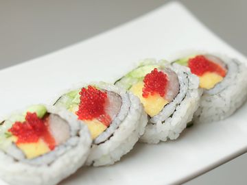 Cucumber, crabmeat, 2 deep-fried shrimps topped with avocado and white mayo & brown sauce